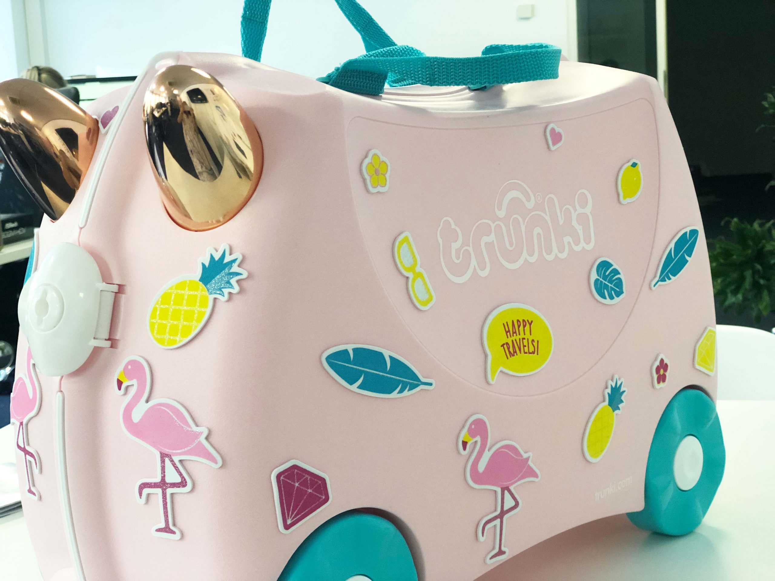 Der Koffer sieht im Design schon wie ein kleiner, süßer Freund aus mit den zwei Hörnern vorne dran – die natürlich zum festhalten gedacht sind und bringt dann noch irgendein super cooles Thema mit sich, wie z.B. Flamingo oder Pirat!